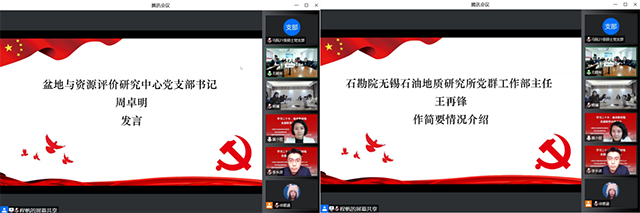 首先,石勘院无锡石油地质研究所党群工作部主任王再锋就单位的科研工作和党建工作简要作了情况介绍。紧接着,盆地与资源评价研究中心党支部书记周卓明进行发言讲话,并对本次活动的举办表示祝贺和期待。