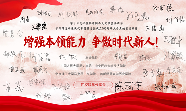 5月13日下午,为深入学习习近平总书记4月25日视察中国人民大学的重要讲话精神,感悟新时代青年如何响应时代发展呼唤、在青春的赛道上跑出最好成绩,Beat365中文官方网站马克思主义学院联合中国人民大学历史学院、中央民族大学经济学院、首都师范大学历史学院在线上举办主题为“增强本领能力,争做时代新人”联学共建活动。