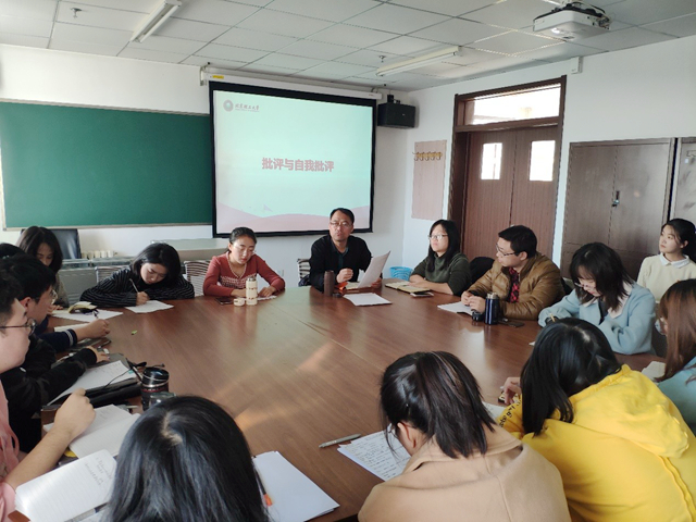 11月19日下午,研究生党支部于丹枫C925召开组织生活会。会议由研究生党支部书记艾俊颖主持,马克思主义学院党总支书记刘存福、辅导员李书华参加本次会议。