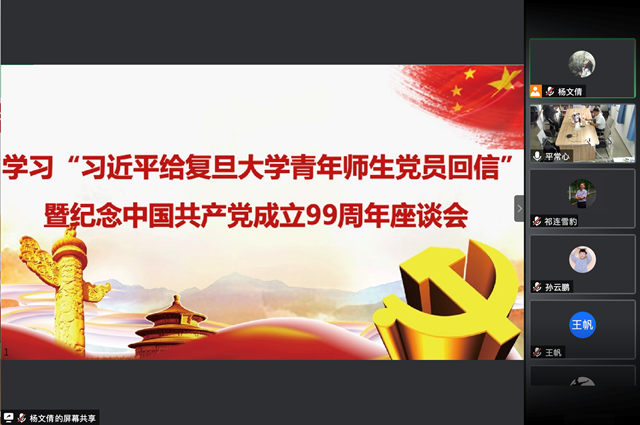 宣讲团成员杨文倩、黄泽远、凡萌玮结合习近平总书记给复旦大学党员师生的回信,分别从宣讲团发展成长、青年学生时代担当,学习党史鉴往知来进行了主旨发言交流。