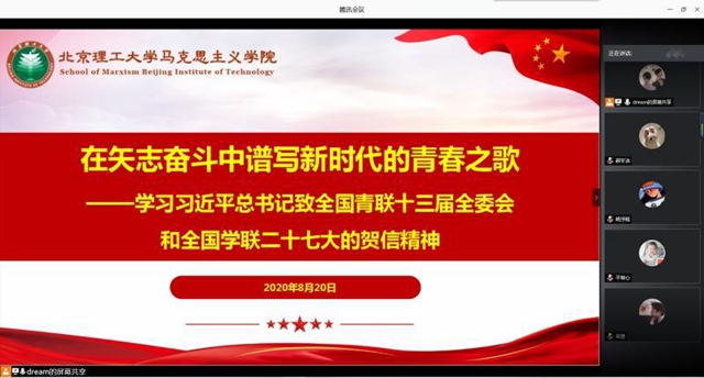 为深入贯彻落实习近平总书记致全国青联十三届全委会和全国学联二十七大的贺信精神,深切体悟党和国家对广大青年和青年学生的关怀,教育引导广大青年学生将总书记的贺信精神转化到实际的工作和学习中去,马克思主义学院于2020年8月20日以腾讯会议形式在线上开展了以“在矢志奋斗中谱写新时代的《青春之歌》”为主题的团日活动。2019级全日制研究生团支部精心组织了本次活动,校团委兼职副书记、学院团委书记张雷老师和辅导员李书华老师与同学们一起参加了本次活动。会议由团支部书记凡萌玮同学主持。