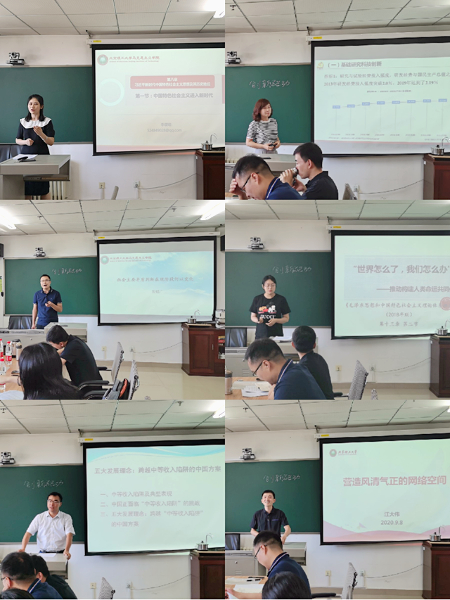 之后,围绕新开课程,教研室组织开展了青年教师教学展示暨教学基本功比赛选拔。李璎珞、高洁、张廷广、李京、祝猛昌、江大伟老师先后围绕新时代的判断依据、创新驱动发展战略、社会主要矛盾变化分析、人类命运共同体理念、五大发展理念以及营造风清气正的网络空间等主题进行了精彩分享,分享了准备《习近平新时代中国特色社会主义思想概论》课程的心得。