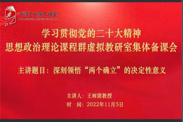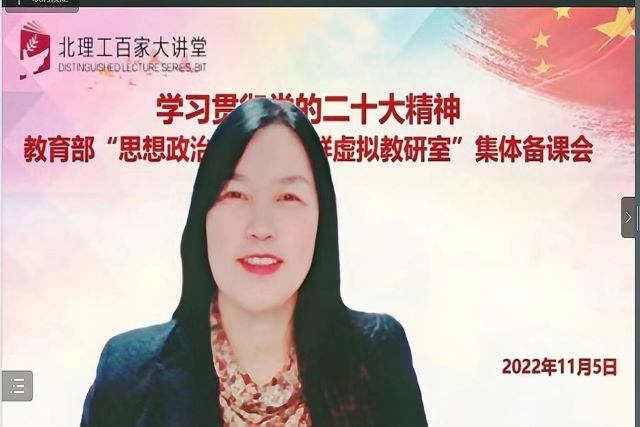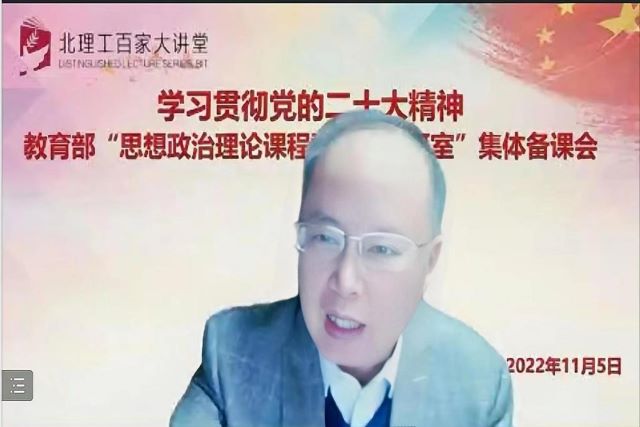为深入学习宣传贯彻党的二十大精神,11月5日晚上,Beat365中文官方网站学生工作部、马克思主义学院、教育部思想政治理论课程群虚拟教研室共同举办 “学习贯彻党的二十大精神——思想政治理论课程群虚拟教研室集体备课会”,拉开该平台系列集体备课会的帷幕。本次活动邀请北京师范大学马克思主义学院王树荫教授做题为《深刻领悟“两个确立”的决定性意义》的专题报告。北理工马克思主义学院思政课专任教师、学工部领导和全校学生党支部书记、青年宣讲团成员,以及武汉大学、复旦大学、兰州大学、南开大学、北京工业大学、云南大学、江西师范大学、内蒙古财经大学等全国各地40余所高校的师生共1000余人参加。会议由北理工马克思主义学院副院长陈洪玲教授主持。