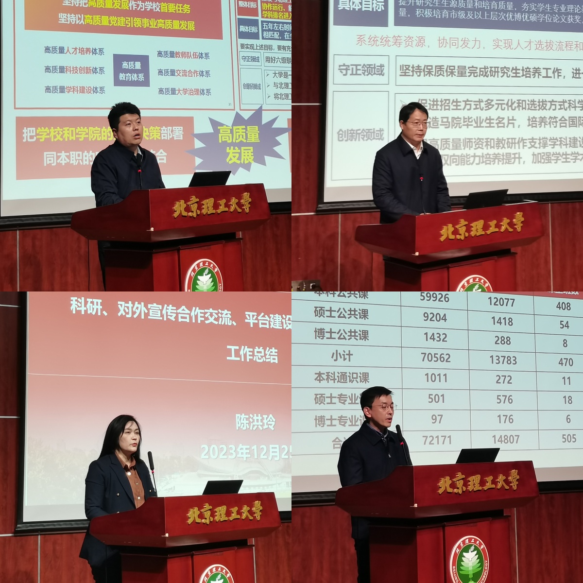 首先,院长刘新刚以《学院高质量发展新阶段与新成绩》为主题做学院工作总结。他表示,2023年学院党政领导班子齐心协力、学院全体师生同舟共济,不断凝心聚力、改革攻坚,学院取得了新成绩、进入高质量发展新阶段。他从主题教育等八个方面对各领域的发展阶段与成绩进行了总结,号召全院教师在高质量发展指引下,取得更大成绩。同时,刘新刚进行了个人述职述廉汇报。