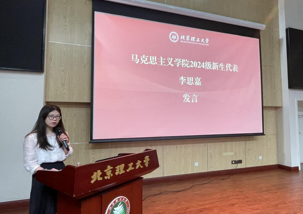 2024级研究生李思嘉同学作为新生代表发言。她分享了自己与学院相遇相知的过程,提出作为北理马院的新生要明确自身身份定位,掌握好并运用好马克思主义的世界观和方法论,积极探索学科交叉融合的前沿创新能力,担负起新时代赋予青年的使命与担当。